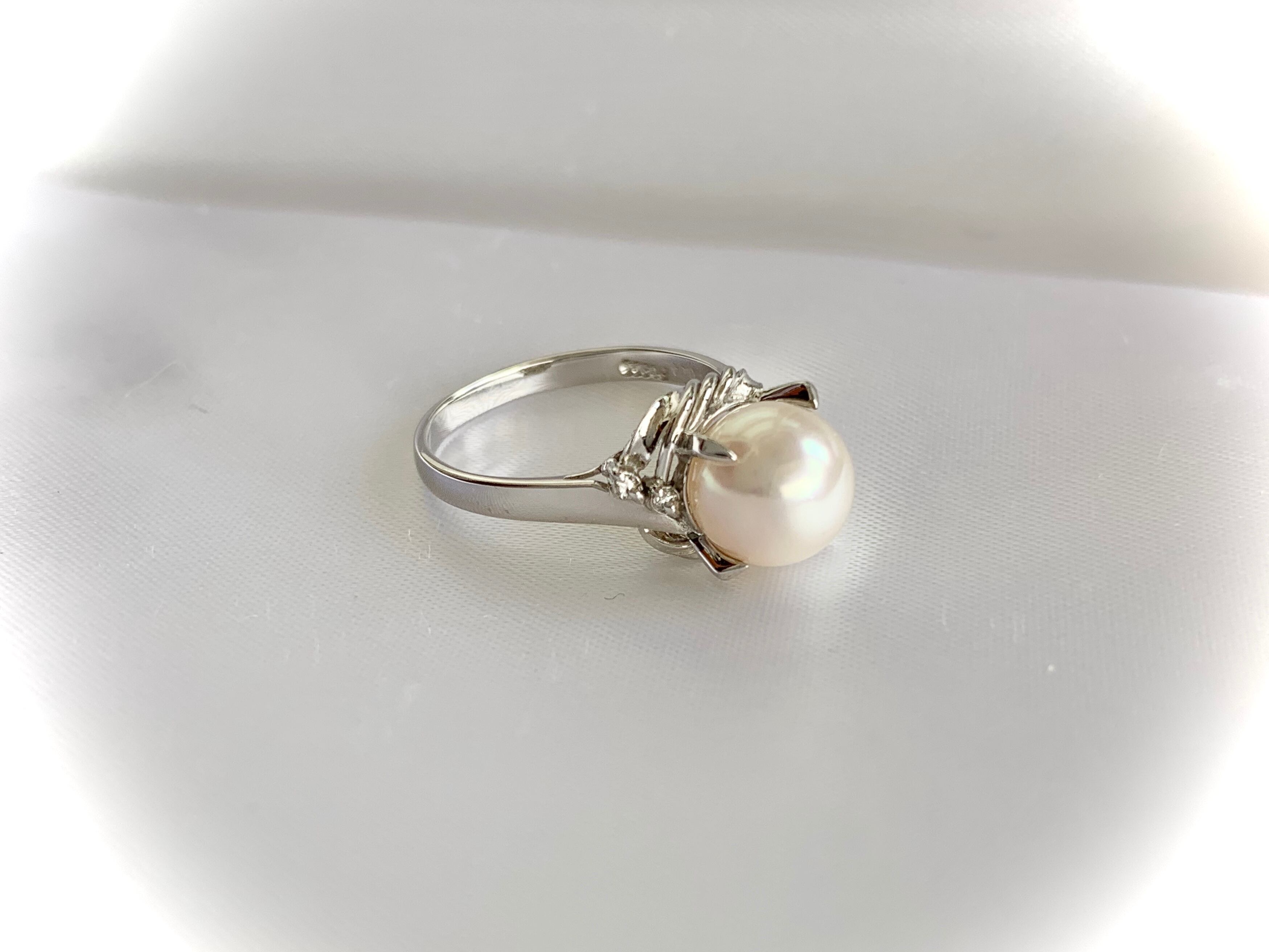 サイドストーンにダイヤをあしらい、ほんのりピンクの可愛いパールに煌びやかさを加えたパールリング。